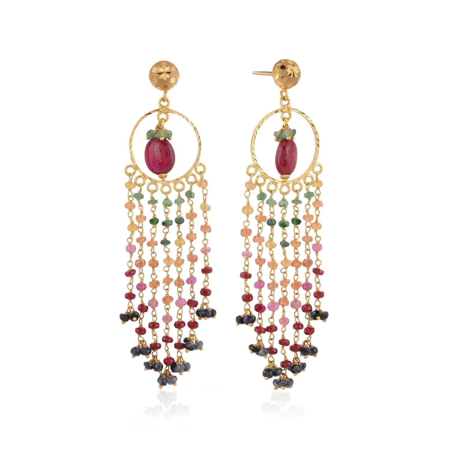 These dazzling earrings are made with precious beads of Ruby, Emerald, Yellow and Blue Sapphire. Such lovely colors of the rainbow to accessorize with! Made with real 14 Karat gold, a precious Ruby Manior long bead hangs from the top so gracefully - adding just that pop of colour you are looking for! For the stylish you, come shine in the Amaltaas hues with these gorgeous precious Earrings.